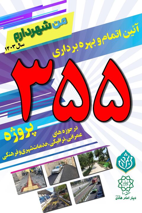 گفتنی است؛ آیین افتتاح از ۳۵۵ پروژه دومین دوره طرح من شهردارم و رونمایی از ۲۰ معبر مزین به نام شهدا در شب میلاد حضرت زینب (س) از ساعت ۱۴ روز چهارشنبه ۱۶ آبان ماه در مجموعه فرهنگی و هنری شهید غنی پور واقع در خیابان قزوین، خیابان شهید بنکدار با حضور اعضای شورای اسلامی شهر تهران، معاونان شهردار تهران، مدیران شهری و منطقه ای، خانواده های معظم شهدا و ایثارگران و شهروندان منطقه ۱۰ برگزار خواهد شد.