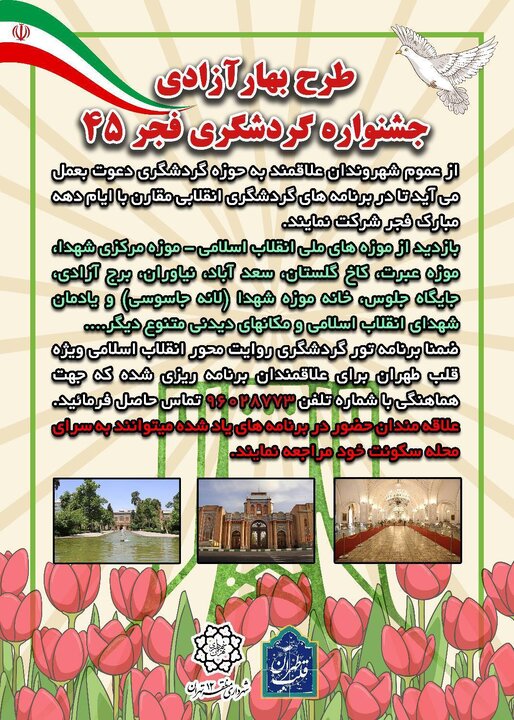 به گزارش شهر به نقل از روابطعمومی شهرداری منطقه۱۲؛ شهردار این منطقه با اشاره به نقش پررنگ محلات و شهروندان قلب تهران در شکل گیری انقلاب اسلامی گفت: طرح راهیان نور انقلاب اسلامی« بهار آزادی» در قالب اجرای تورهای نیم روزه از سوی محلات به سمت مراکز گردشگری انقلابی از ۱۲ تا ۲۲ بهمن ماه برای شهروندان اجرا می شود.