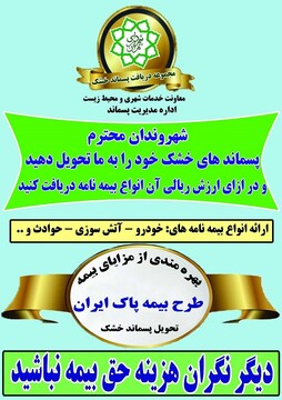 شهردار منطقه با اشاره به اینکه به مناسبت هفته زمین پاک و در کنار شرکت در برنامه پاکسازی طبیعت، در بوستان فرا منطقه ای بسیج نیز این طرح از صبح شنبه ۹اردیبهشت اجرایی و شهروندان می‌توانند با تحویل پسماندهای خشک خوداز مزایای بیمه ی پاک برخوردار شوند، یاداور شد:شهروندان منطقه جهت مشارکت در طرح و کسب اطلاعات بیشتر می توانند علاوه بر مراجعه به غرفه های و اداره پسماند منطقه با شماره‌های ۰۲۱۶۷۴۵۱ و ۰۹۱۹۲۱۳۹۵۲۵ تماس بگیرند.