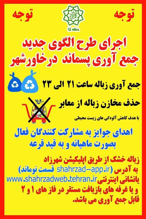 وی در ادامه بیان کرد: در راستای اجرای طرح الگوی جدید جمع آوری پسماند در خاورشهر ، زباله ها ساعت ۲۱ تا ۲۳ در درب منازل جمع آوری می شوند براین اساس لازم است شهروندان گرامی زباله های خود را راس ساعت ۲۱ در درب منازل خود قرار داده تا در اسرع وقت این زباله ها جمع آوری شود.