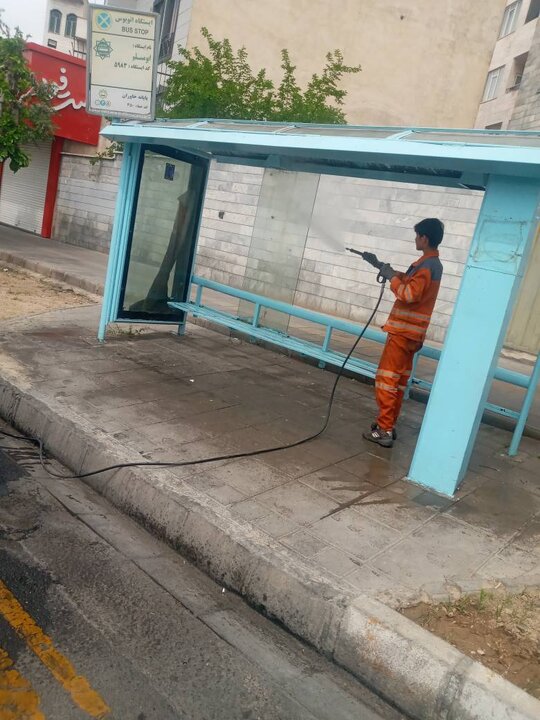 شستشوی ۳۲ ایستگاه اتوبوس در سطح ناحیه ۵ منطقه ۱۵