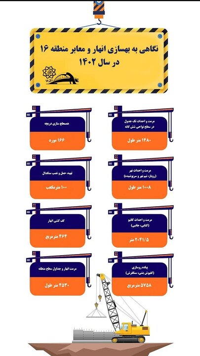 به گزارش روابط عمومی شهرداری منطقه ۱۶، محمد امین سالاری پور ، شهردار این منطقه با اشاره به اجرای طرح تحول بیستگانه خدمت در سال ۱۴۰۲ گفت : از آنجا که مرمت و بهسازی جداول و انهار از سرفصلهای این طرح است ، معاونت عمران رصد مستمر و اصلاح و بهروزرسانی انهار منطقه را در دستور کار خود قرار داده که با بازدیدهای میدانی و شناسایی مشکلات ، نسبت به مرمت و احداث ۱۰۰۸ متر طول نهر ، ۲۰۴۱ متر کانیو ، ۱۴۸۰متر طول مرمت و احداث تک جدول در سطح نواحی ششگانه ، ۵۷۵۸ متر مربع پیاده رو سازی ، مرمت انهار و جداول ۴۵۳۰متر مربع ، ۴۶۴ متر مربع کف کشی انهار ، ۱۰۰ متر مکعب تهیه و نصب سنگدال و ۱۶۶ مورد هم سطح سازی دریچه در منطقه اقدام شد.