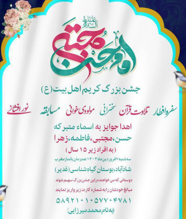 بر پایه این گزارش، مولودی خوانی، تلاوت قرآن، نور افشانی، مسابقه و تجلیل از دارندگان زیر ۱۵ سال نام های حسن، مجتبی، فاطمه و زهرا از دیگر بخشهای این مراسم معنوی بوده که در اوقات افطار روز سه شنبه ۷ فروردین ماه برگزار خواهد شد.