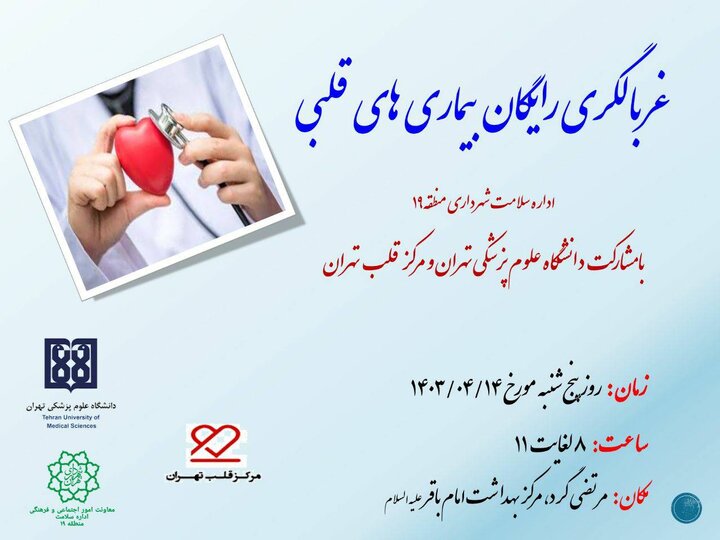 تیم جهادی برای غربالگری رایگان بیماری های قلبی درحریم منطقه ۱۹ روز پنج‌شنبه چهاردهم تیرماه در شهرک مرتضی‌گرد مرکز بهداشت امام باقر (ع) مستقر می‌شود.