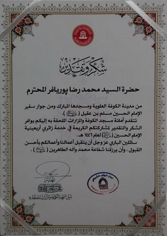 امین مسجد کوفه در این نشست، از شهردار منطقه ۲۱ و خدام الحسین شهرداری منطقه بابت مشارکت و همکاری در خدمت به زائرین اربعین امام حسین (ع) و همچنان ارائه نظافت و رفت و روب پیرامون مسجد معظم کوفه و دیگر خدمات مانند خدمات پزشکی و بهداشتی، پخت و پز و خدمات فرهنگی برای زائران حسینی قدردانی کرد.