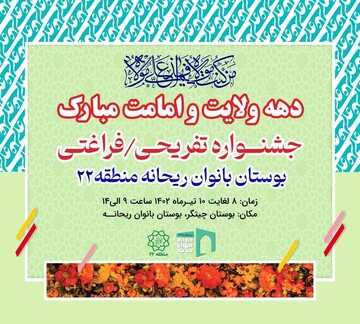 به گزارش شهر به نقل از روابط عمومی شهرداری منطقه ۲۲، این جشنواره به مناسبت آغاز دهه ولایت از روز پنج شنبه ۸ تا دهم تیرماه با برپایی دهها محیط تفریحی، فرهنگی، آمورزشی و ورزشی از ساعت ۱۰ صبح الی ۱۴ در بوستان ریحانه پذیرای بانوان و دختران تهرانی خواهد بود.