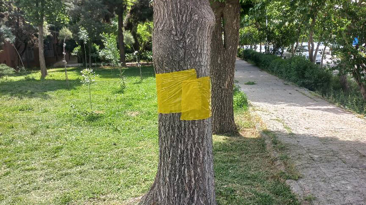 آغاز نصب نوارهای زرد چسبنده بر درختان قدیمی‌ترین شهرک غرب تهران
